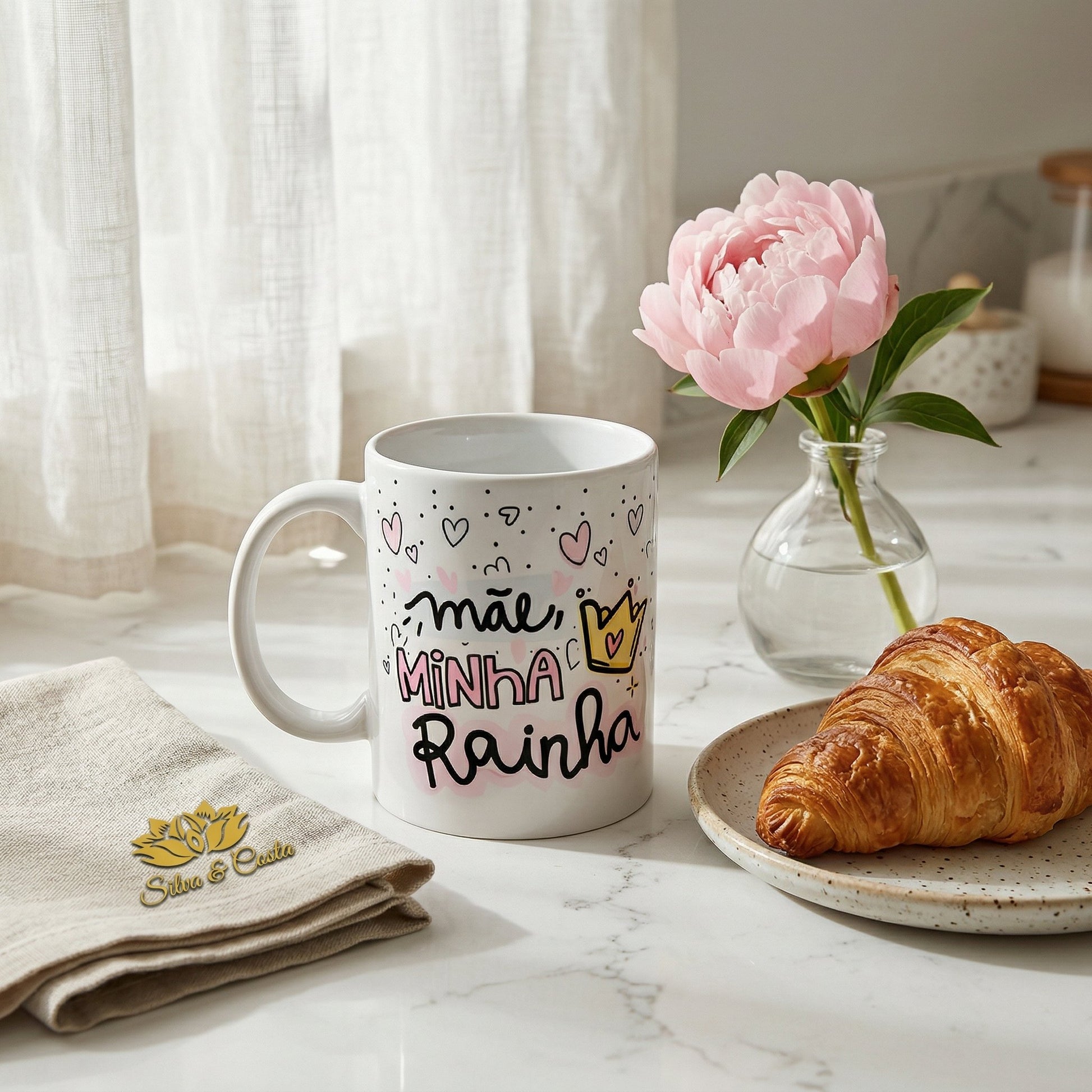 A caneca personalizada da Silva & Costa não é apenas um objeto utilitário; é um veículo de afeto diário. Imagine a expressão de carinho dela ao receber uma peça exclusiva, adornada com a mensagem "mãe, minha rainha", coroa e corações delicados.